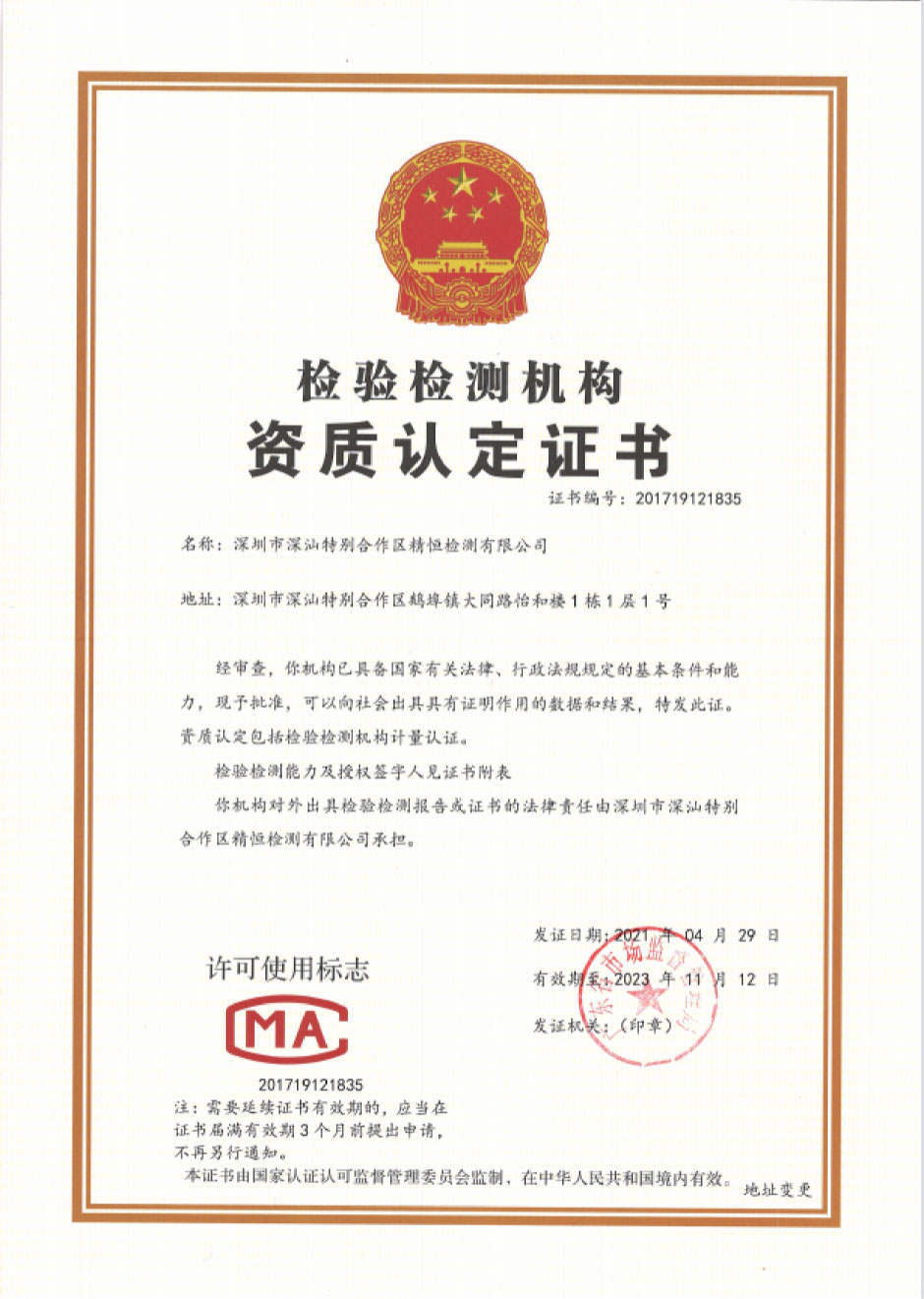 深圳市深汕特别合作区精恒检测有限公司前身为深汕特别合作区精恒工程检验有限公司,由问鼎网页版登录入口控股投资,于二零一四年十二月在汕尾市住房和城乡建设局备案(证书号:JCJG-2015003),从事检验检测工作,二零一五年深汕特别合作区招商引资,为了更好的服务于深汕特别合作区,方便于建设管理者严把建设工程质量关。根据国家相关法律、法规要求,当地也必须有国家认可的检验检测机构,作为一个深圳市检测经验丰富的检测机构,经汕尾市政府、深汕特别合作区管理委员会等领导审批后,作为第二批进驻深汕特别合作区企业。由于建设发展的需要,本公司于二零二一年十月二十七日更名为深圳市深汕特别合作区精恒检测有限公司。